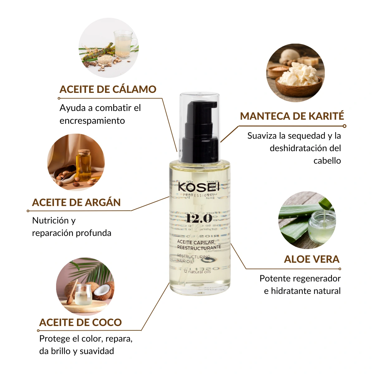 Disfruta de un pelo sano, brillante y sedoso con el aceite reestructurante Kosei 12.0. Un producto ideal para proteger tu cabello a diario, elaborado con una combinación de aceites naturales de primera calidad y sin siliconas añadidas.